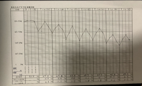 結果的には、2週間で-3.6kgだったのですが、外食する前の日には、既に-4kgだったので、私としては成功したと思っています。ありがとうございました。